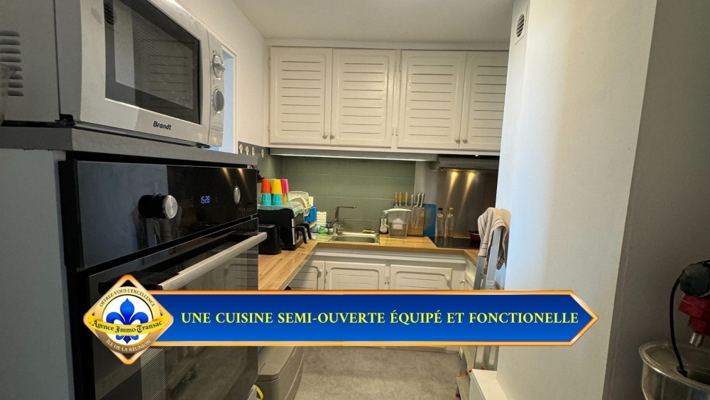 CUISINE SEMI-OUVERTE ÉQUIPÉE : La cuisine en L, fonctionnelle et bien organisée, permet de cuisiner tout en restant connecté au séjour, avec FOUR, PLAQUES et HOTTE déjà installés pour plus de confort.