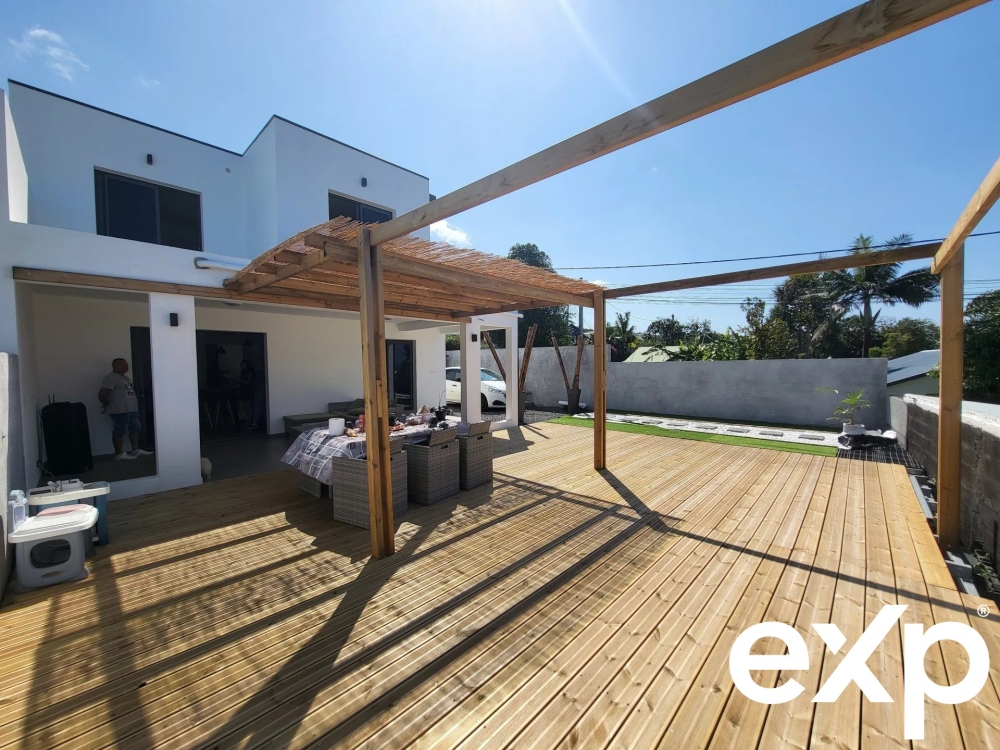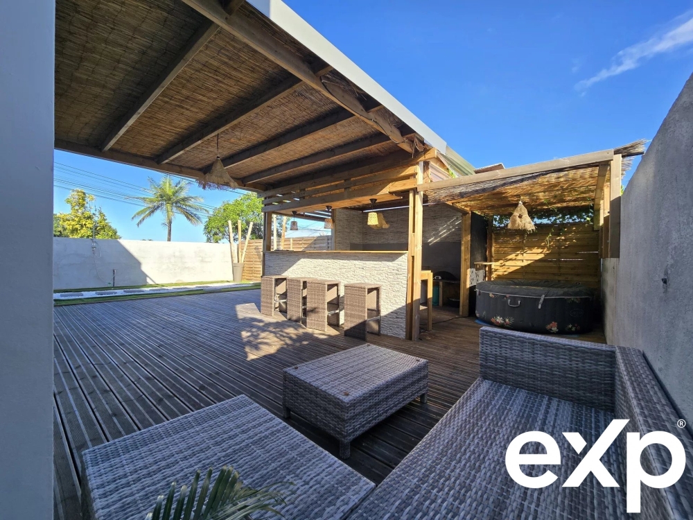 La terrasse couverte offre un espace de vie supplémentaire, parfait pour les moments de détente.