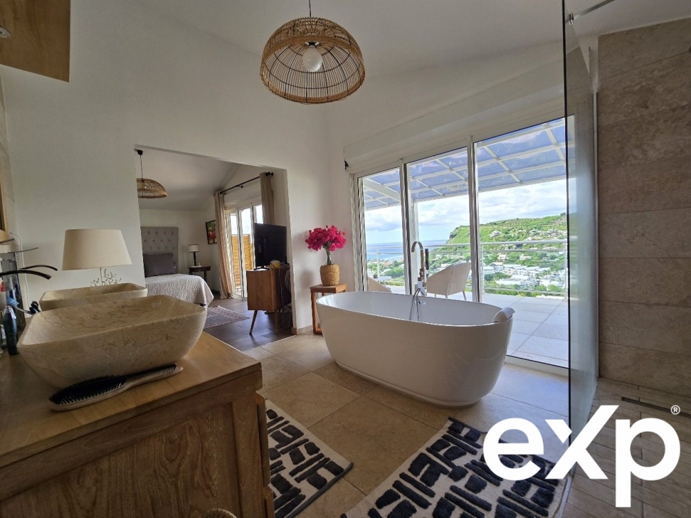 Édifiée sur une parcelle arborée de plus se 750m², la propriété bénéficie d'un environnement calme au sein d'un lotissement sécurisé. Les extérieurs sont aménagés autour d'une grande piscine au sel récemment rénovée, profitant d'une vue mer panoramique et des reliefs de Boucan Canot.