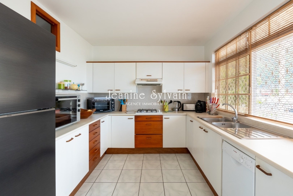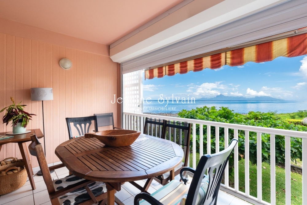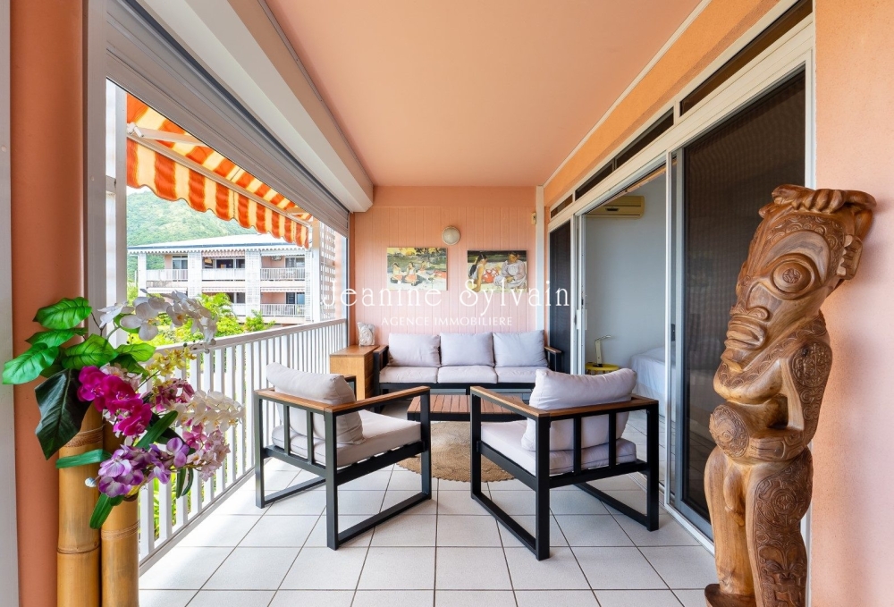 Jolie appartement de type F3 au 1e étage, comprenant 2 chambres dont une climatisée avec rangement, une salle d'eau, un salon, une cuisine entièrement équipée, une belle terrasse couverte donnant sur la vue Moorea.
