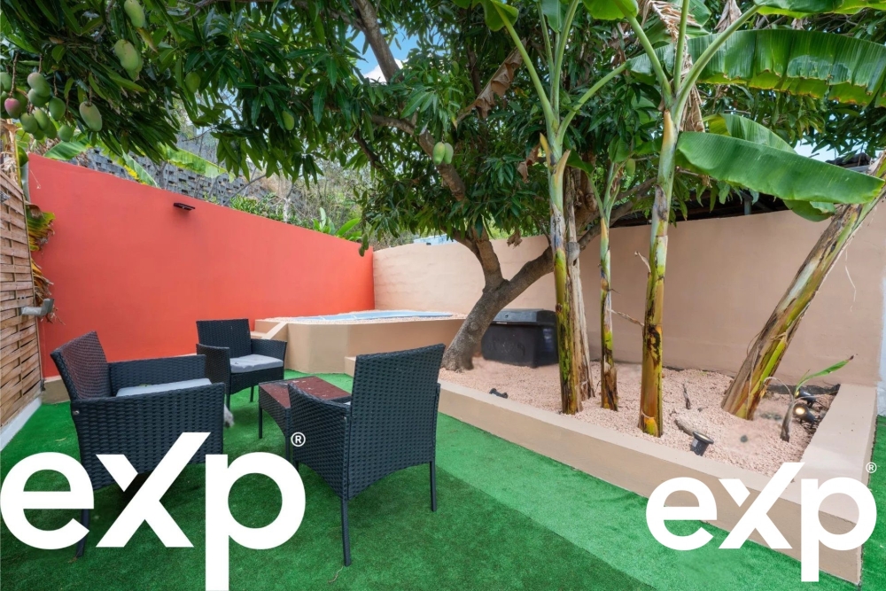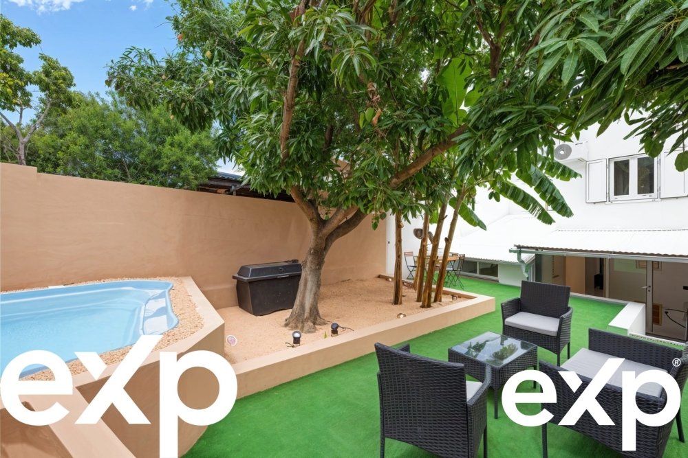 L'extérieur comprend un espace avant exposé plein Ouest, idéal pour profiter des couchers de soleil, ainsi qu'un jardin arrière aménagé avec une piscine de moins de 10 m², nécessitant peu d'entretien et sans taxe additionnelle.