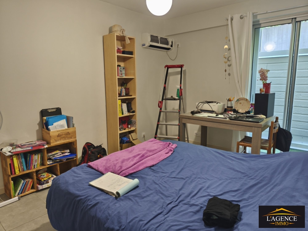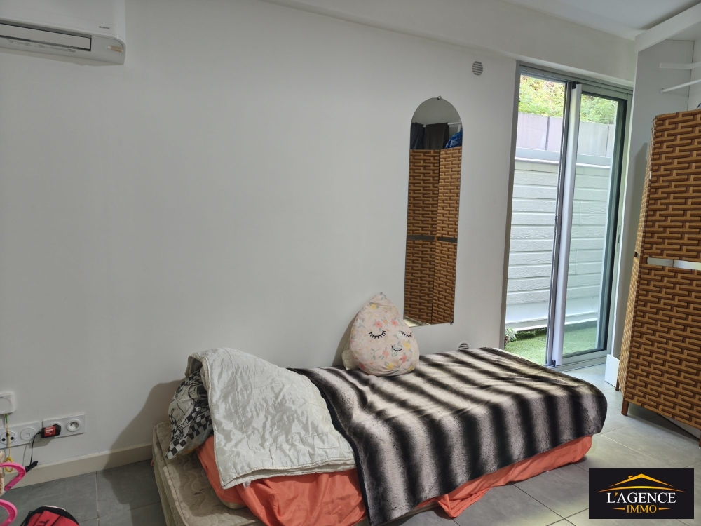 Une première chambre climatisée, réalisée sur l'espace de vie, donne également accès à un espace extérieur relié à la terrasse par une baie vitrée.