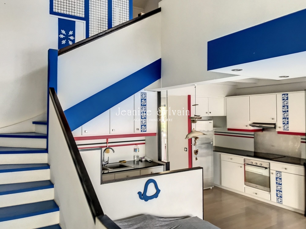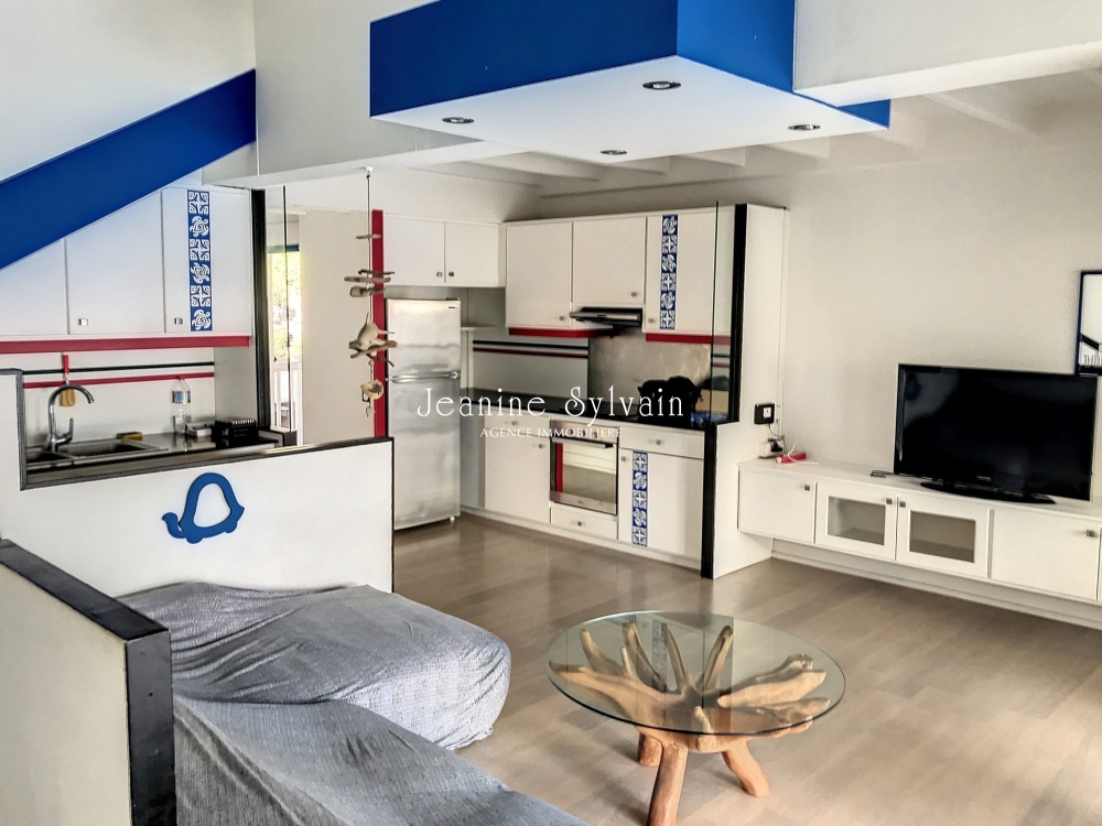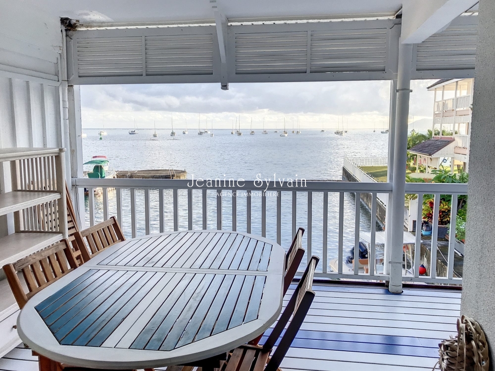 Dans une petite copropriété les pieds dans l'eau, avec ammarage bateau privatif donnant accès direct au lagon, appartement F3 duplex comprenant en bas 1 chambre climatisée avec dressing et une salle d'eau, 1 wc indépendant, cuisine équipée, séjour climatisé, grande terrasse couverte face au lagon.