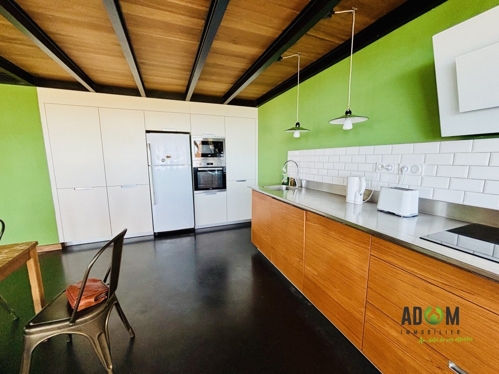 Ouvert sur l'extérieur grâce à ses larges baies, le vaste salon séjour avec plafond cathédrale vous offre, une vue plongeante sur l'océan. Il se prolonge par une cuisine spacieuse et fonctionnelle pensée pour cuisiner, partager et recevoir en toute simplicité.