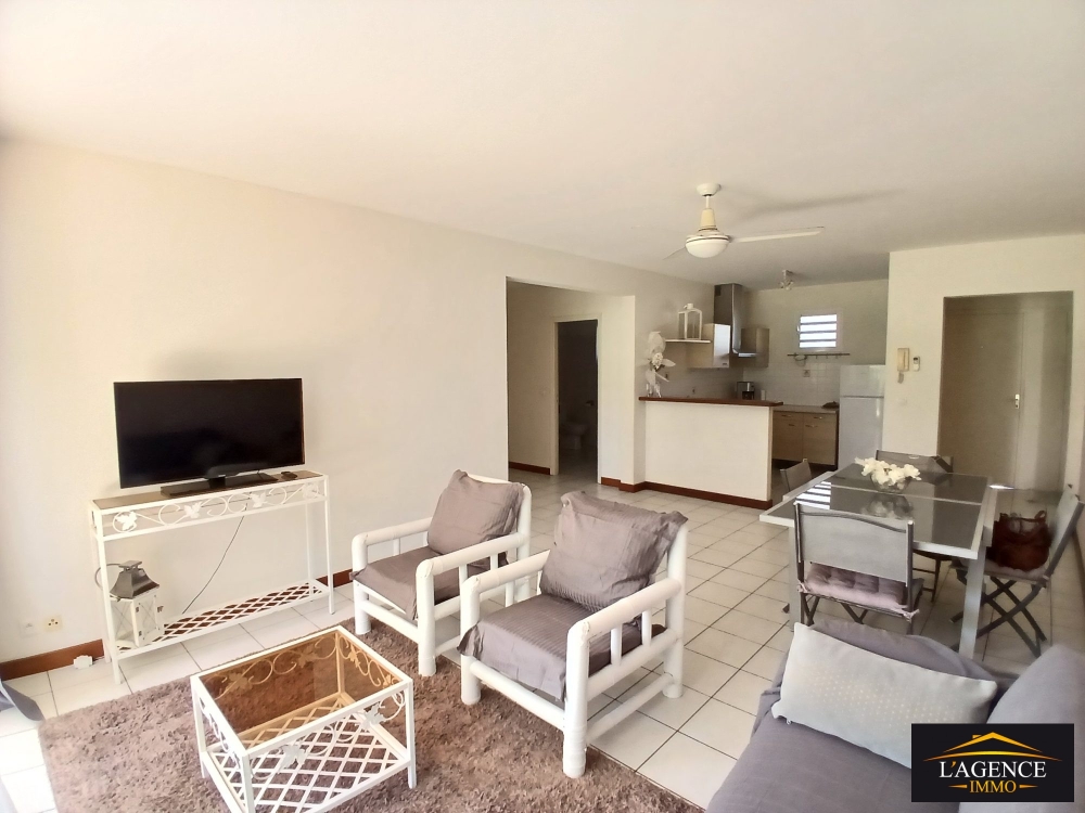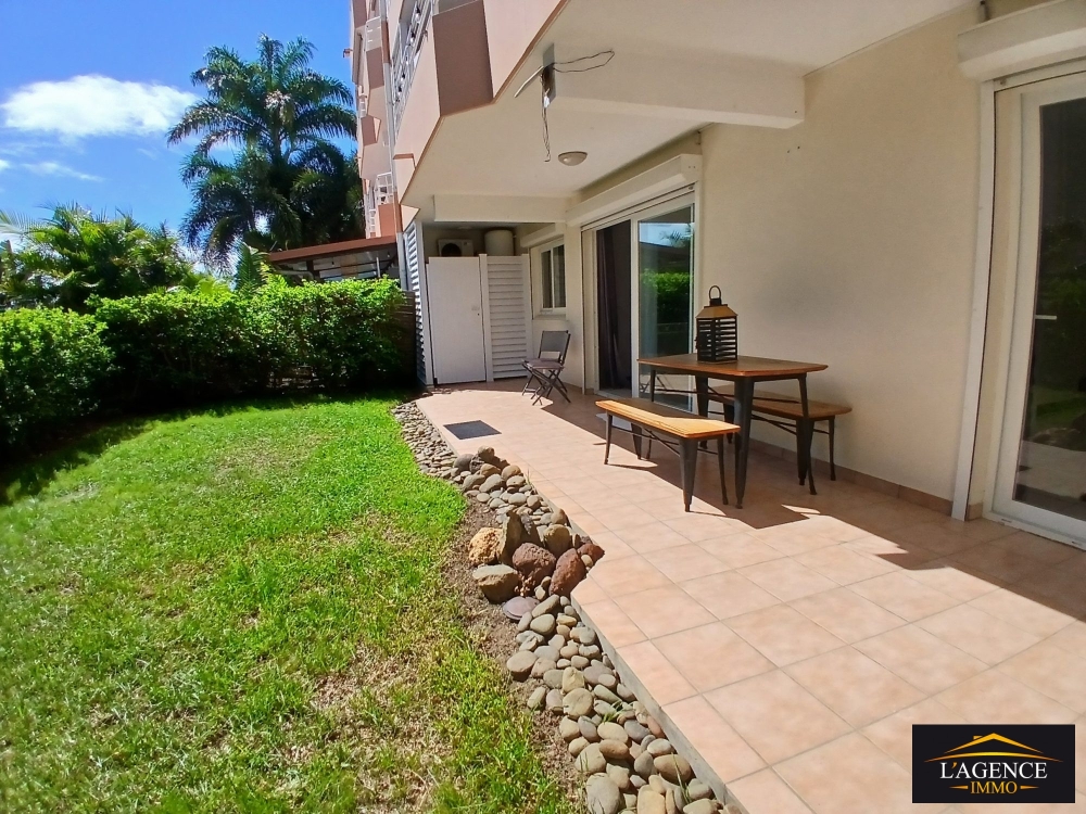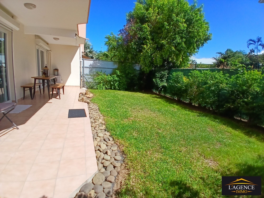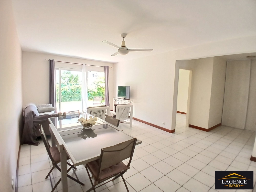 Dans une résidence calme et sécurisée, appartement F3 en rez-de-jardin d'une superficie d'environ 84m² composée d'une entrée, d'une cuisine équipée et aménagée, d'un lumineux séjour, d'une chambre climatisée avec placard, d'une salle d'eau avec WC, d'une seconde chambre climatisée avec double placards, salle d'eau et WC et d'une terrasse couverte donnant sur un petit jardin.