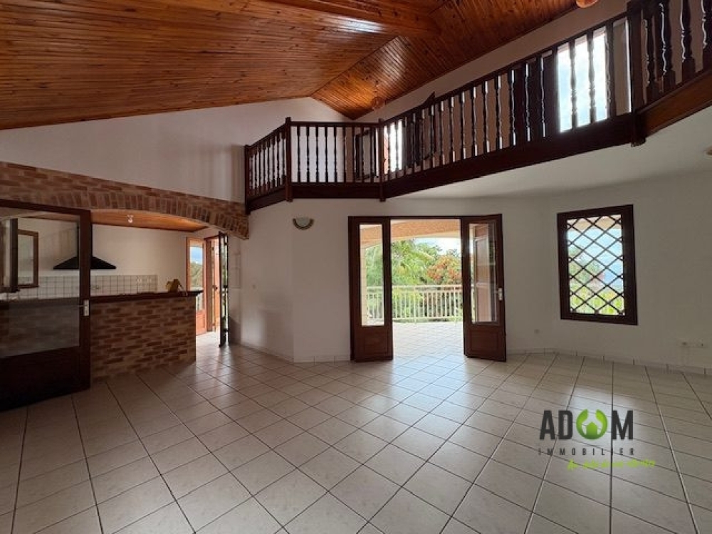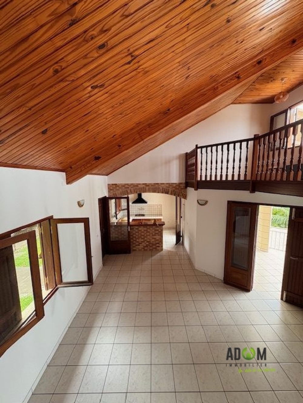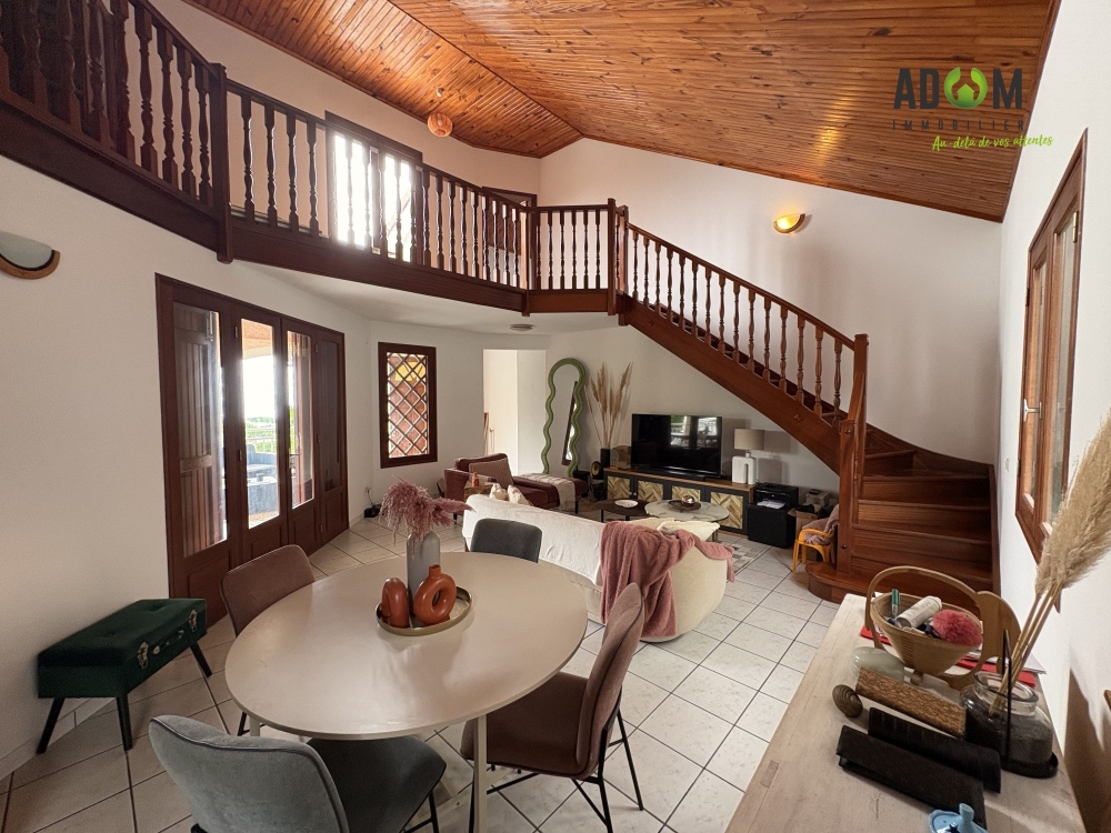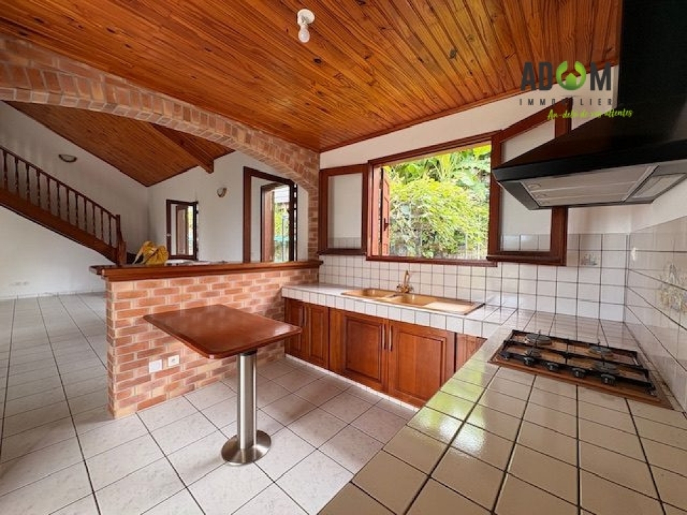 À l'étage principal, la maison s'articule autour d'un grand séjour cathédrale très lumineux, ouvert sur une cuisine aménagée et entièrement équipée; le tout donnant sur une jolie varangue de 31 m2 avec vue mer. Ce niveau comprend également deux chambres, une salle d'eau avec baignoire d'angle, douche et vasque ainsi qu'un toilette indépendant.