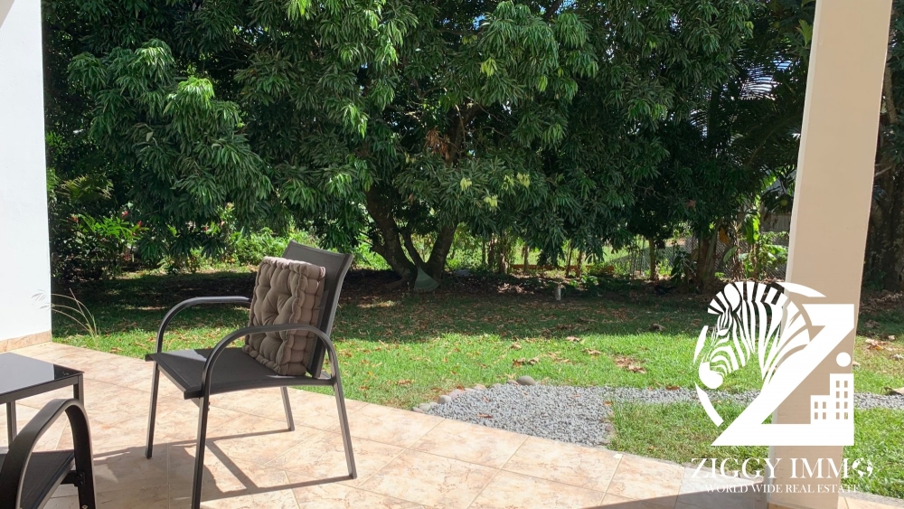 Composé de Deux chambres, une salle d'eau, une grande pièce de vie, d'une cuisine aménagée et équipée, d'une terrasse couverte et d'un jardin magnifiquement arboré !!