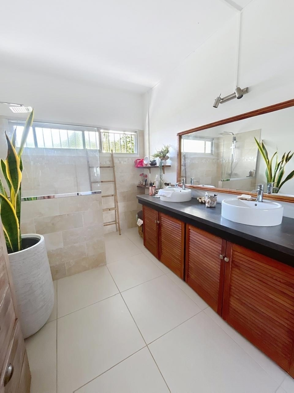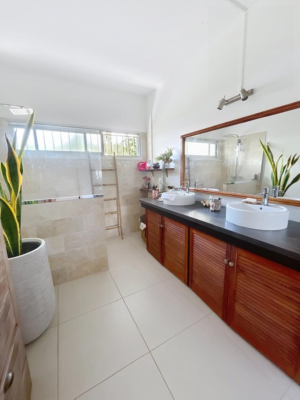 La maison principale se compose d'une cuisine ouverte sur un vaste séjour, offrant un espace de vie convivial et chaleureux, prolongé par une spacieuse varangue, idéale pour profiter pleinement de l'extérieur. Vous y trouverez également deux chambres, une grande pièce polyvalente pouvant accueillir deux chambres supplémentaires ou un espace de loisirs, ainsi qu'une salle d'eau et des toilettes indépendantes.