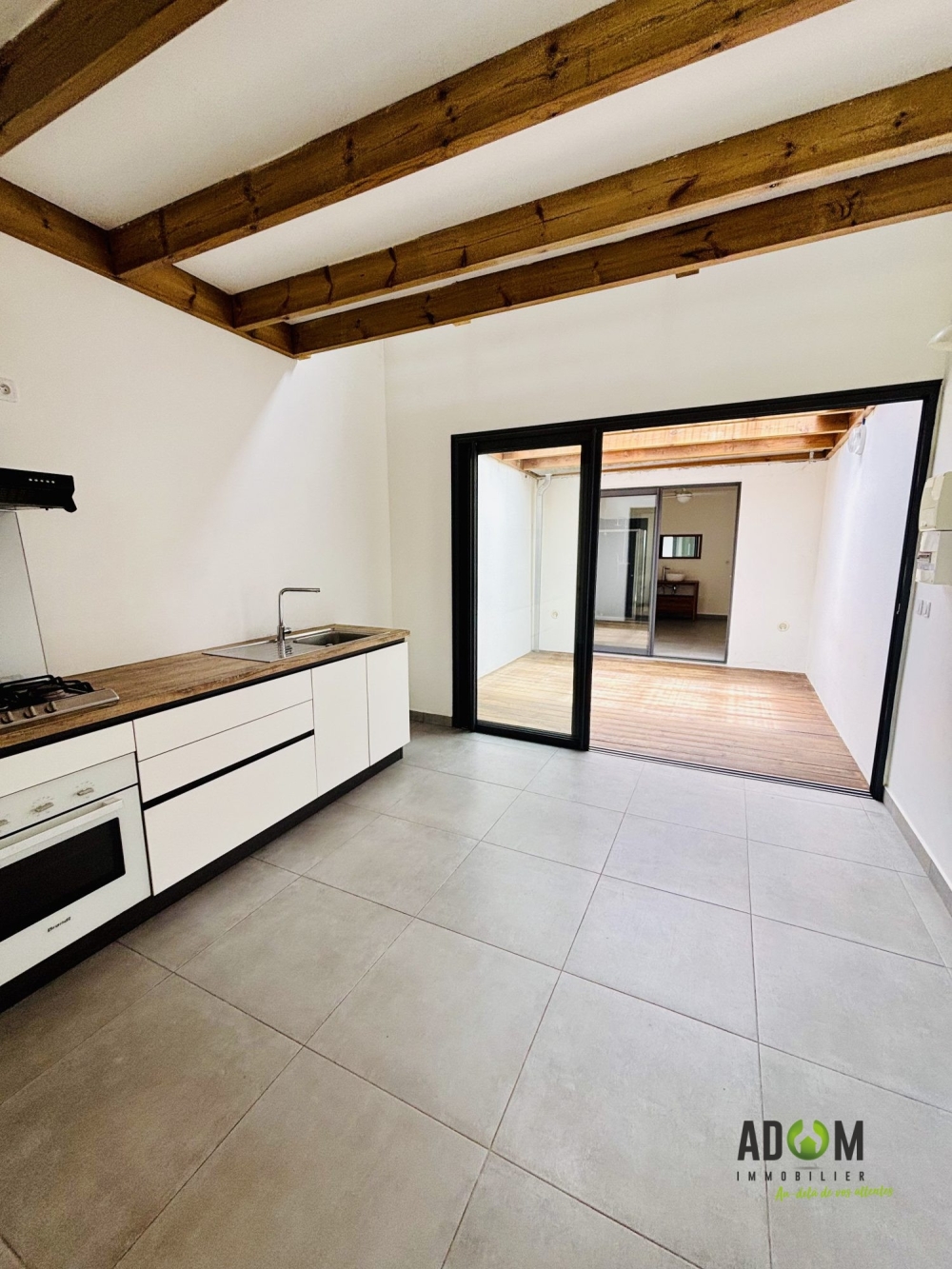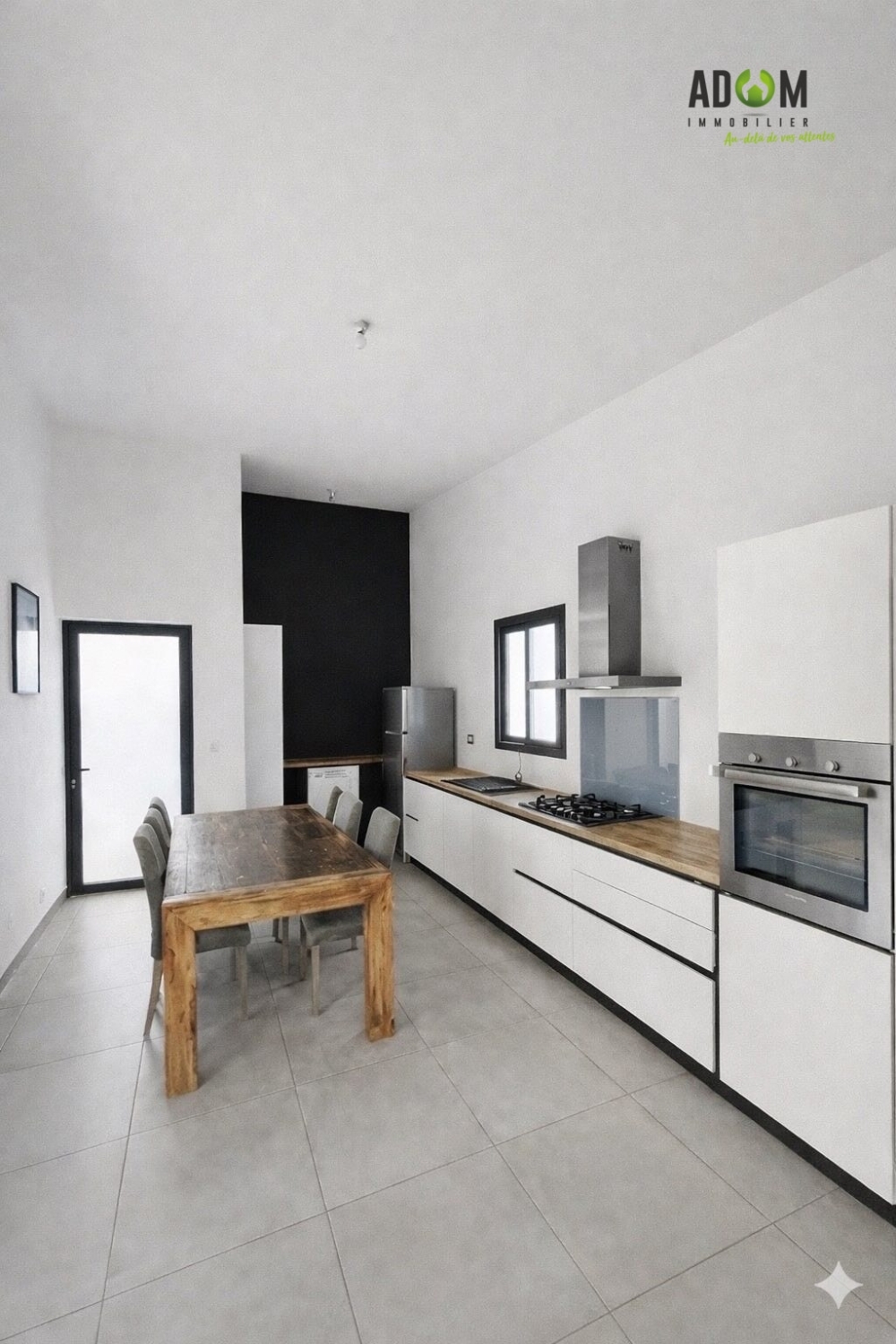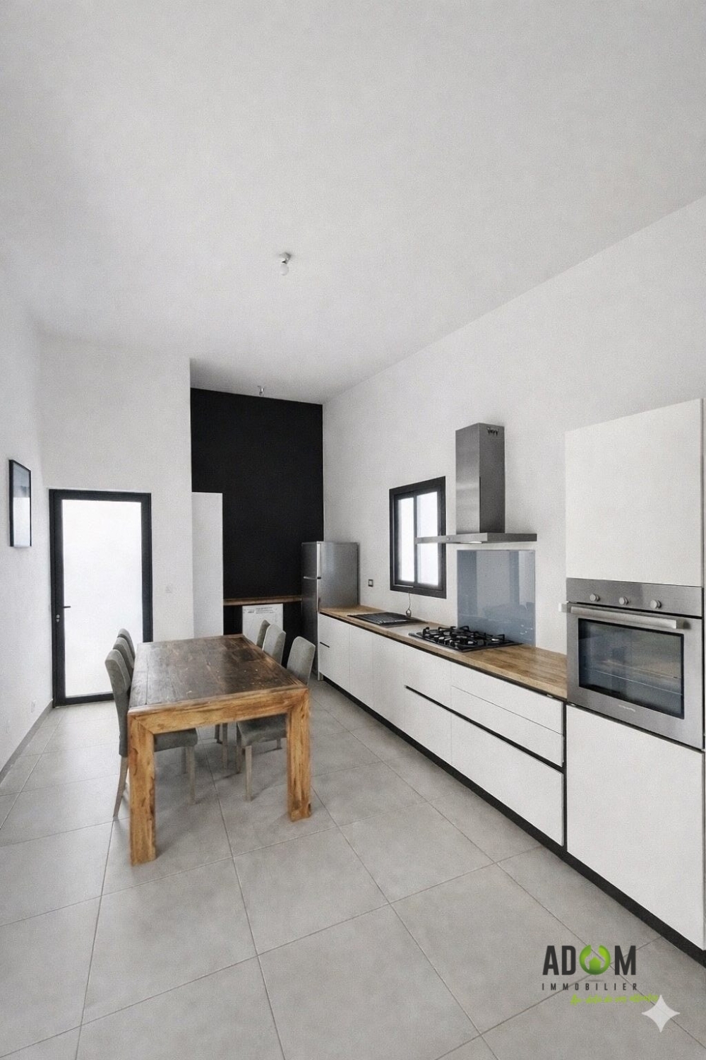 Un vaste espace de vie avec une belle hauteur sous plafond, comprenant une cuisine aménagée et partiellement équipée ouvert sur un salon-séjour baigné de lumière grâce à la proximité d'un patio couvert.