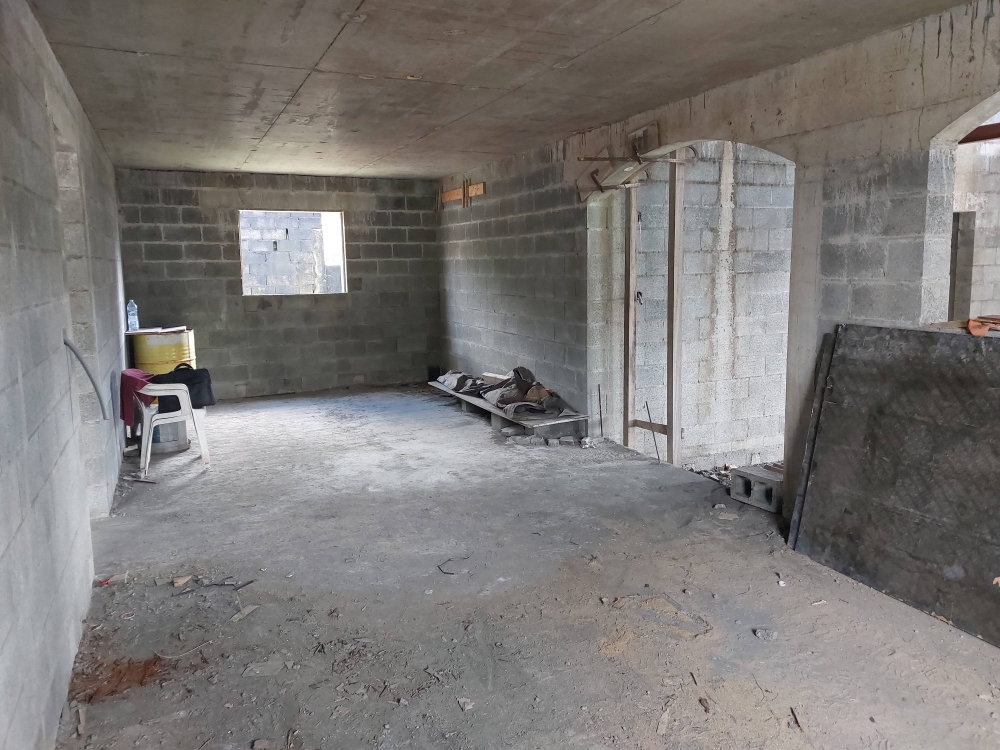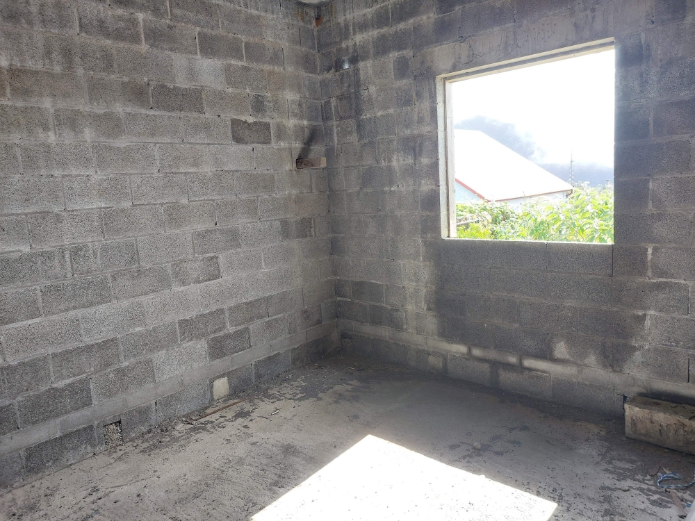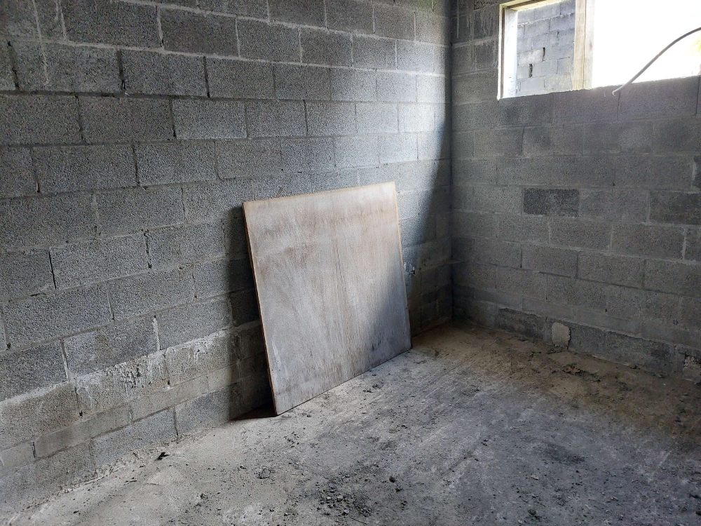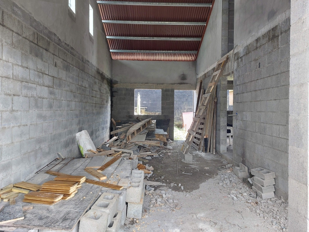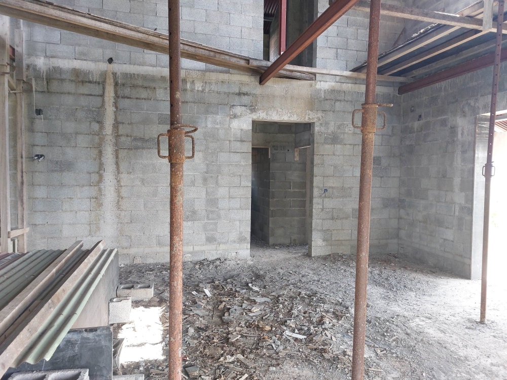Le crépis est fait manuellement, dalle béton coulé de 15 cm, cloisons en pierres. Une partie de l'électricité est faite.