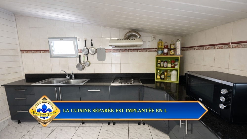 CUISINE SÉPARÉE FONCTIONNELLE : Implantée en L, la cuisine propose un plan de travail optimisé avec rangements et VENTILATION NATURELLE. Une base saine et fonctionnelle au quotidien.