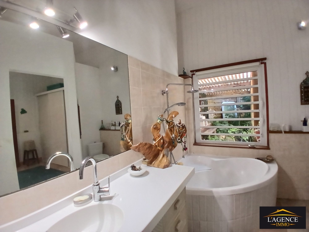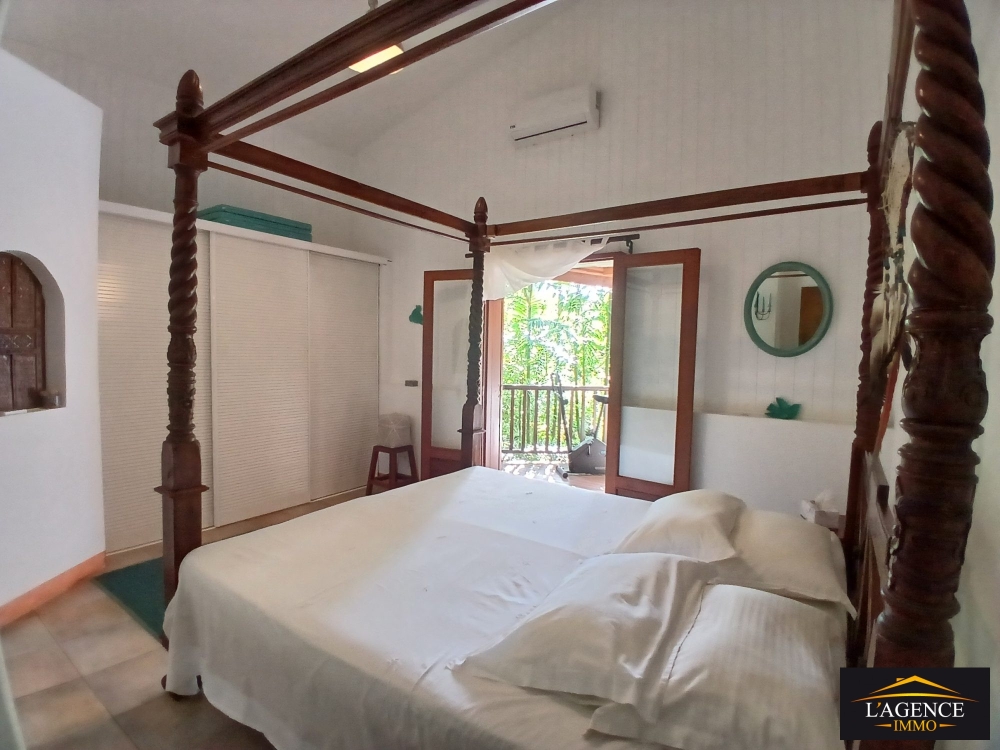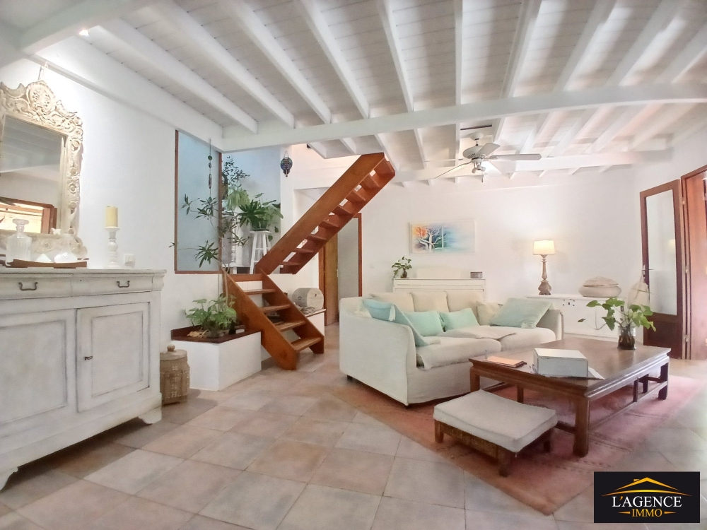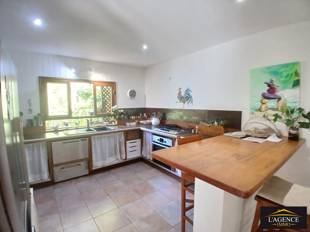 Édifiée sur trois niveaux, la villa principale se compose au rez-de-chaussée d'une cuisine équipée et aménagée ouverte sur un séjour lumineux, d'une chambre avec placards, d'une salle de bain avec WC ainsi qu'une grande terrasse couverte