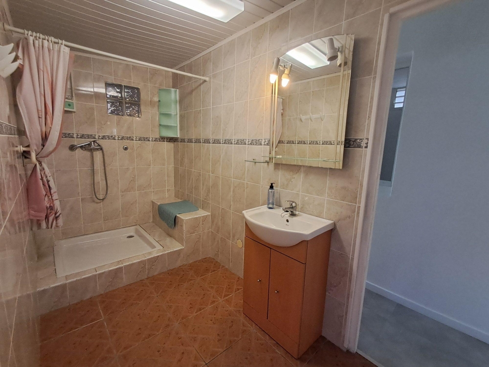 Une maison d'environ 119 m2 sur un terrain d'environ 400 m2 comprenant une grande cuisine ancienne ouverte avec séjour avec ventillateur, 2 chambres dont 1 climatisée, une salle de bain à neuf douche italienne, WC indépendant, un très grand garage pouvant se transformer en grand salon ou pièce de votre choix, avec jardin, place de parking intérieur et extérieur. Il est piscinable + cuisine extérieure.