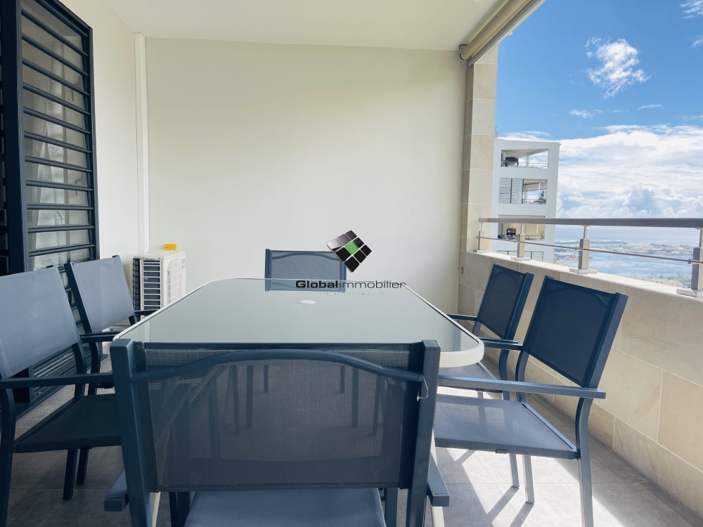 La terrasse couverte de 14 m2 offre une vue sur la rade de Papeete.