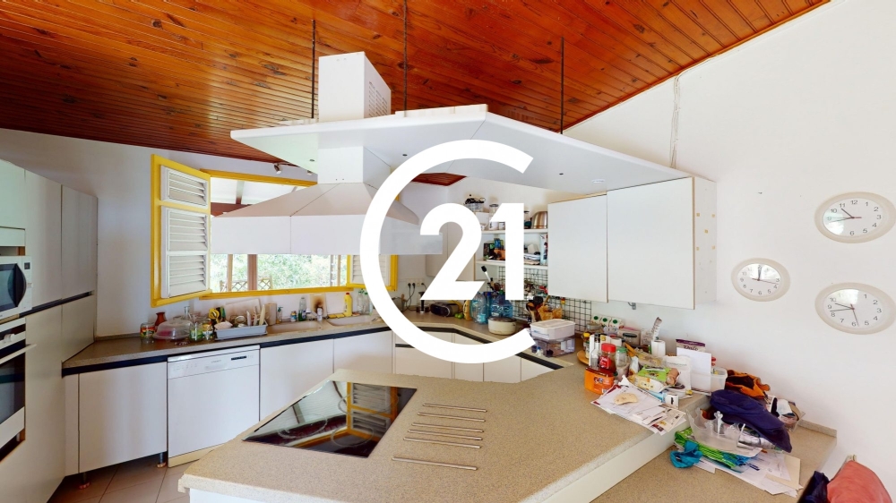 Édifiée sur deux niveaux, la villa dispose d'une cuisine aménagée. L'intérieur nécessite un rafraîchissement, offrant ainsi l'opportunité de repenser les espaces à votre goût.