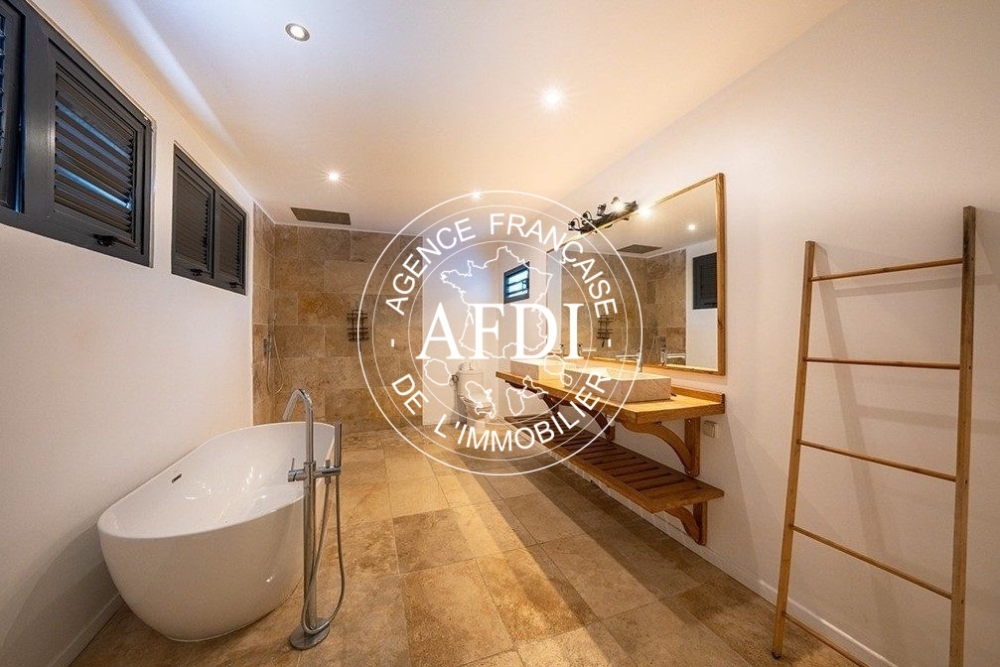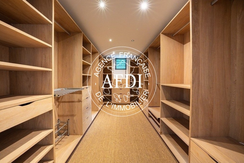 Au rez-de-chaussée, la suite parentale impose son style : une salle de bain somptueuse, aux matériaux nobles et finitions d'exception, et un dressing en bois rare qui respire l'élégance.