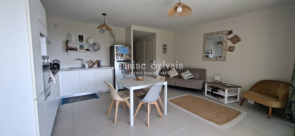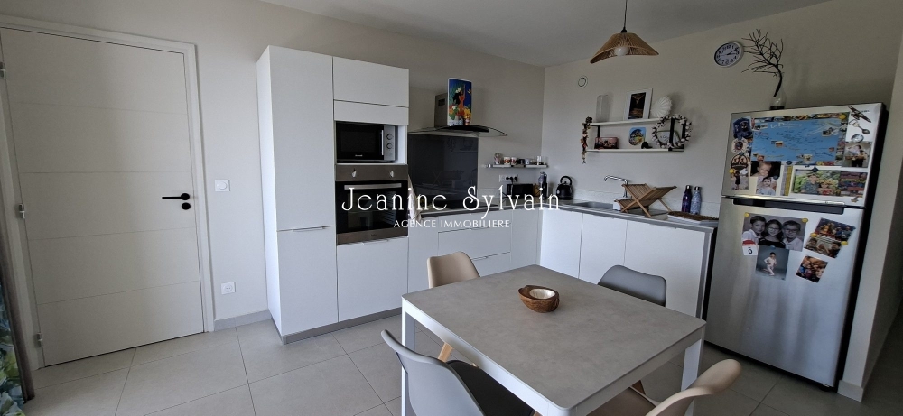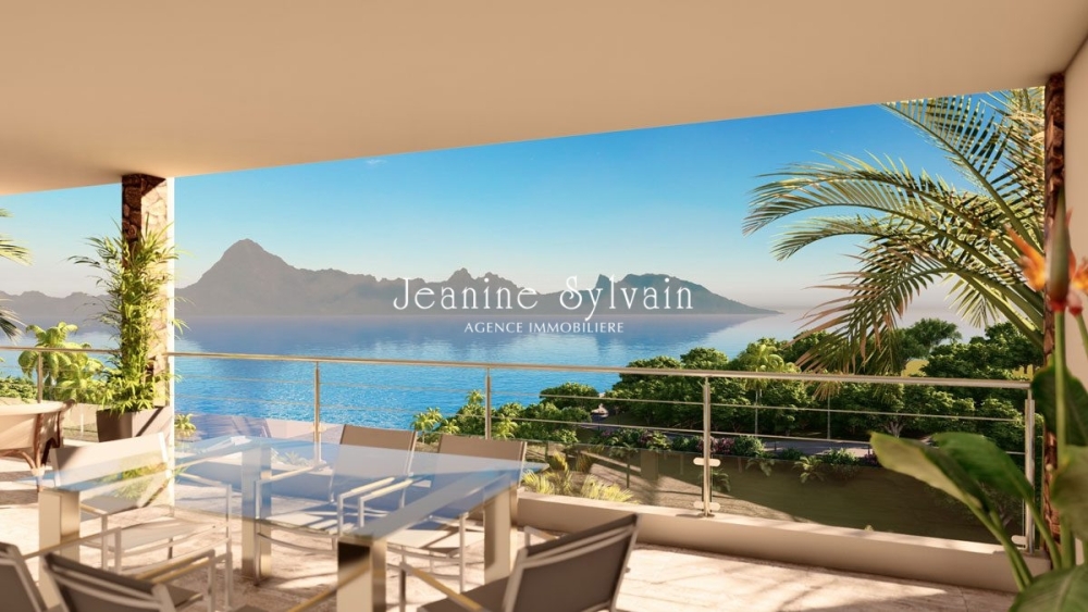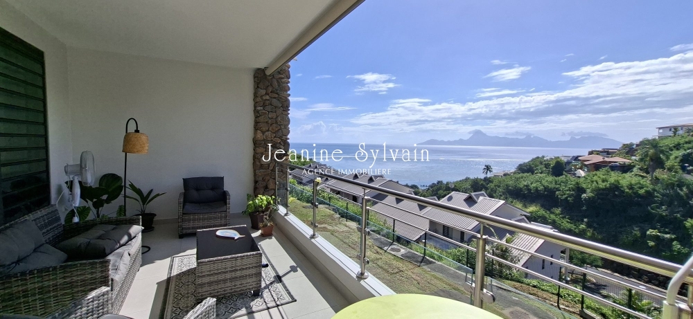 Cuisine moderne meublée et équipée ouverte sur le salon, terrasse de 18m2 avec superbe vue mer et Moorea, 2 chambres climatisées, 2 salles d'eau, wc indépendant, buanderie, 2 places de parking privatives.