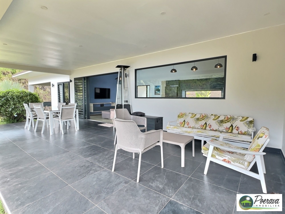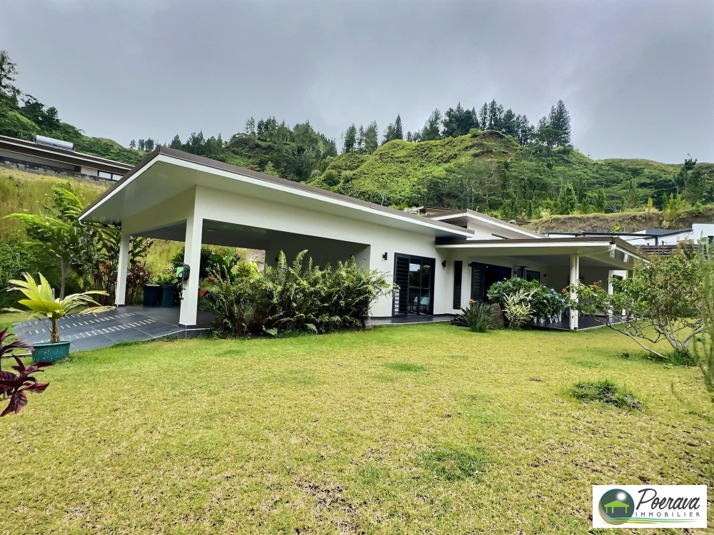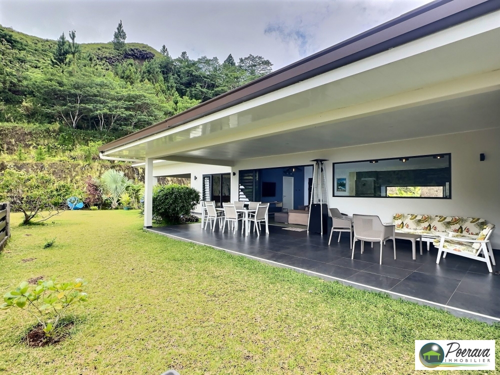Édifiée sur un terrain d'environ 1 200 m², dont 850 m² de terrain plat et piscinable, la propriété offre un cadre de vie agréable avec une vue partielle sur Moorea.