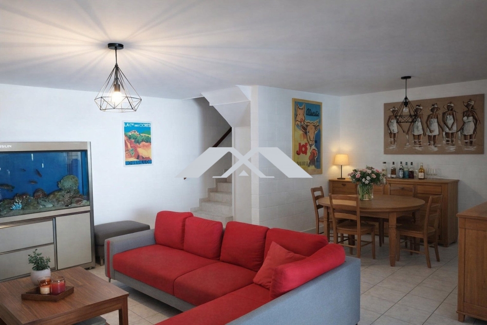 Il se compose d'un salon/salle à manger d'environ 30 m², d'une cuisine aménagée indépendante avec passe-plat, de 3 chambres dont une en rez-de-chaussée, d'un bureau et d'une grande pièce en sous-sol idéale pour une salle de jeux ou un espace permettant de recevoir vos amis.