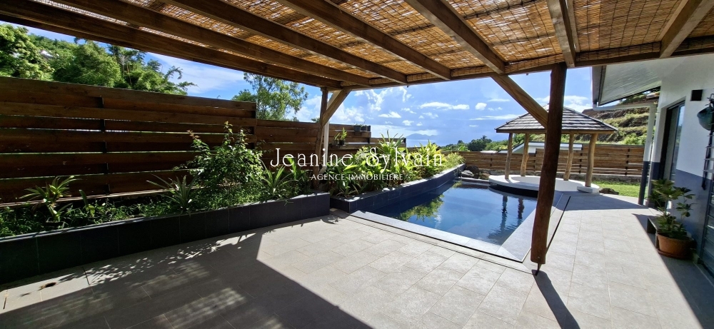 Profitez d'une jolie terrasse couverte donnant sur une piscine au sel et son fare potee intégré avec coin bar comme à l'hôtel pour partager de très bons moments en famille ou entre amis et d'un joli coin jardin.