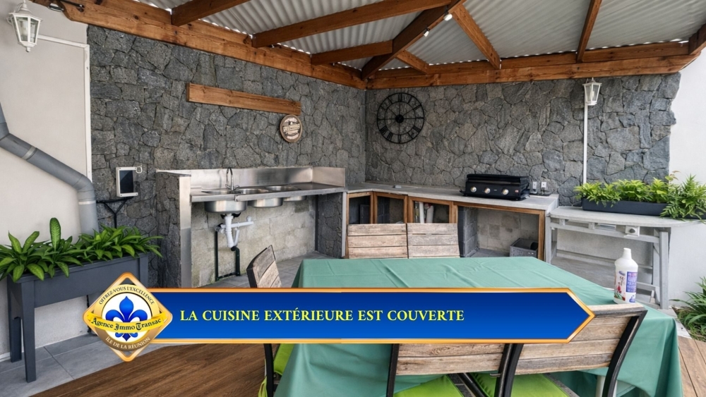 CUISINE D'ÉTÉ ET JACUZZI : L'espace extérieur couvert avec barbecue fixe et jacuzzi est pensé pour les repas et les journées prolongées autour de la piscine. Il ajoute une dimension de RÉCEPTION très recherchée.