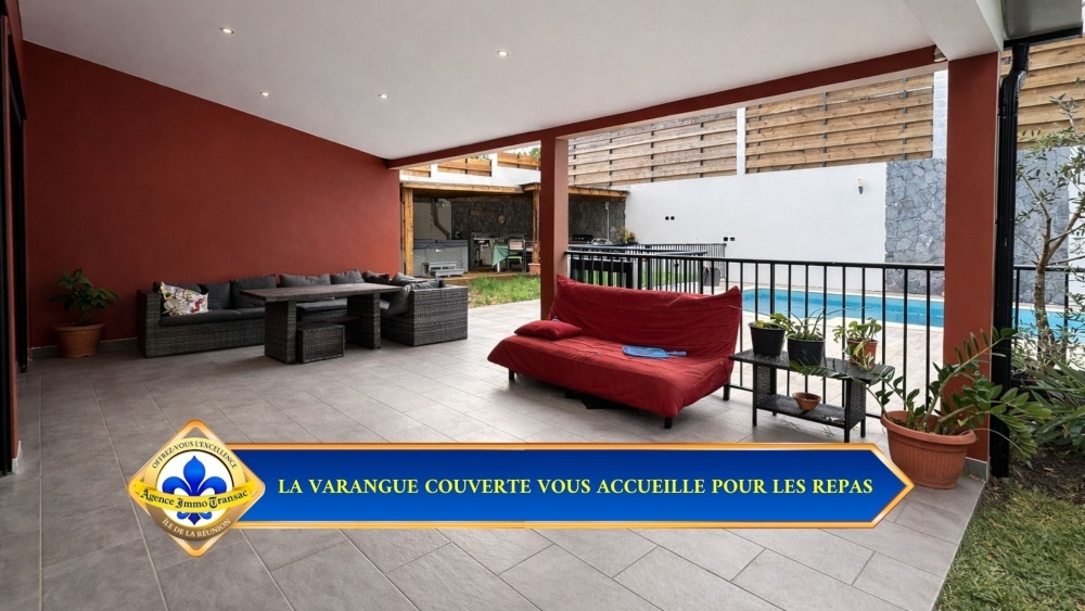 TERRASSE ET VARANGUE DE 50 M² : La varangue au mur rouge terracotta prolonge le séjour vers la piscine. Elle accueille un salon extérieur et offre un espace protégé pour les repas et la détente toute l'année.