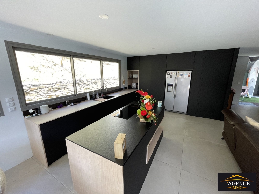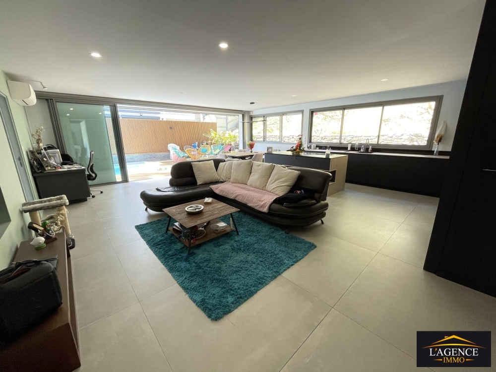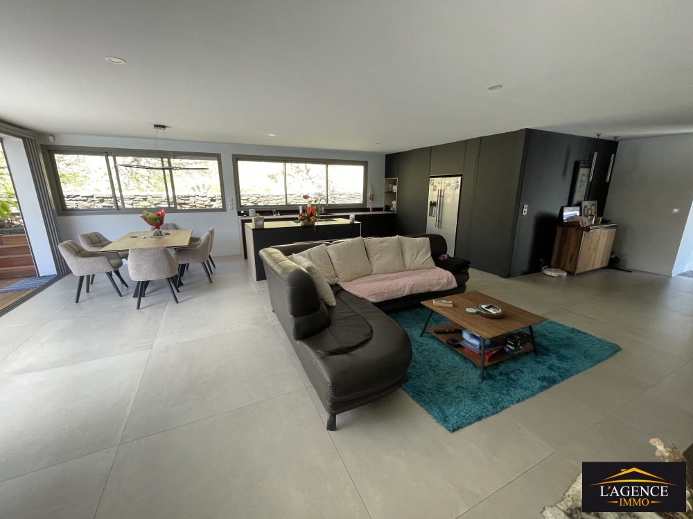 Entrée indépendante sur la pièce de vie composée d'une cuisine moderne et équipée, d'un salon et d'une salle à manger.