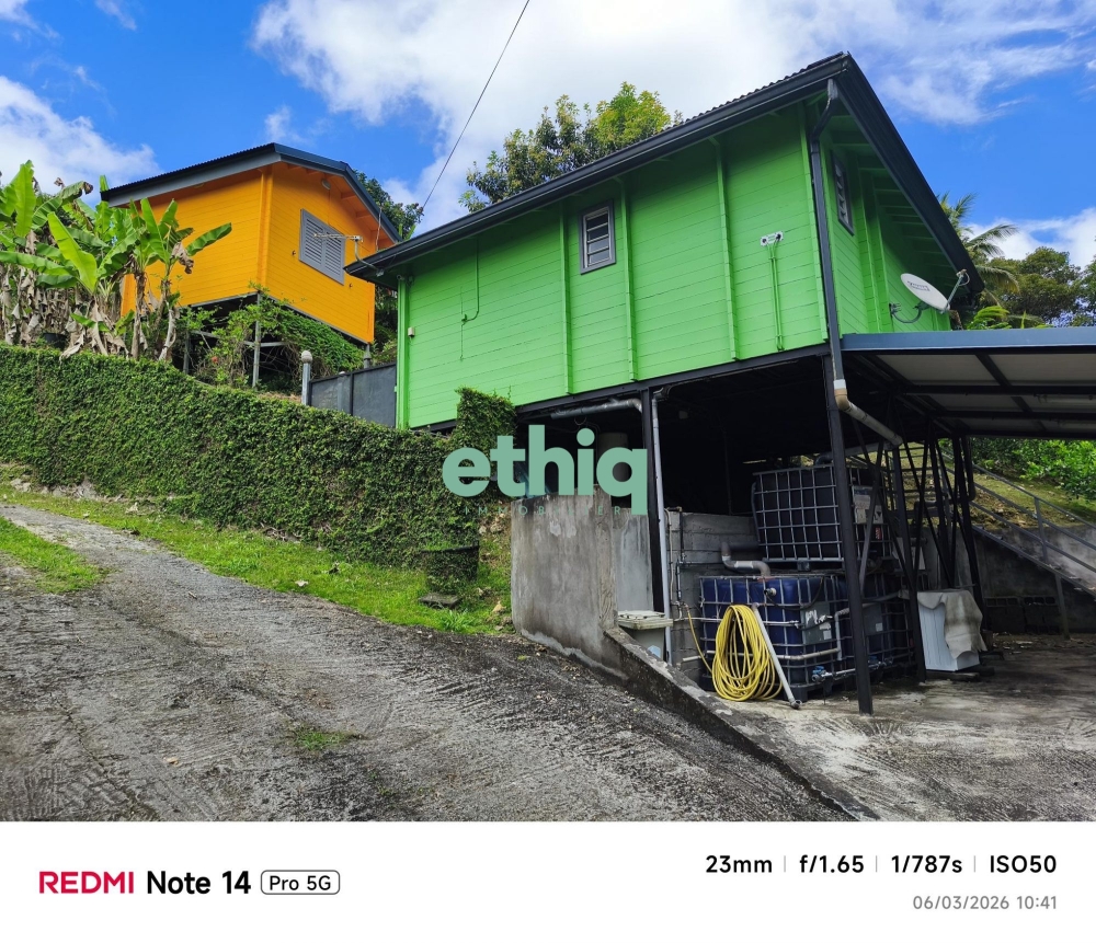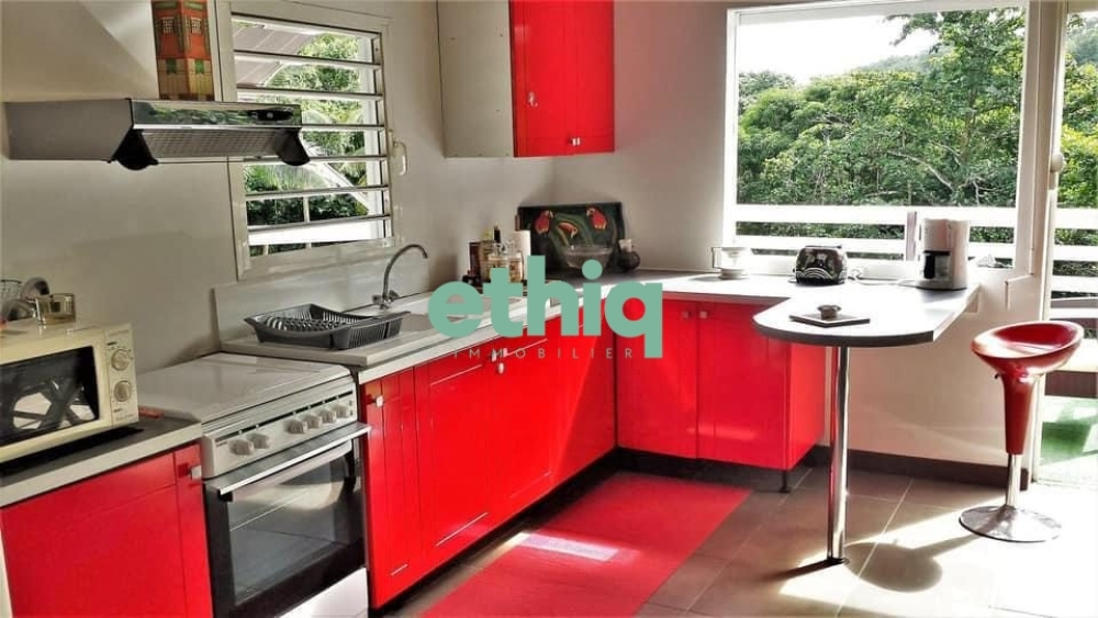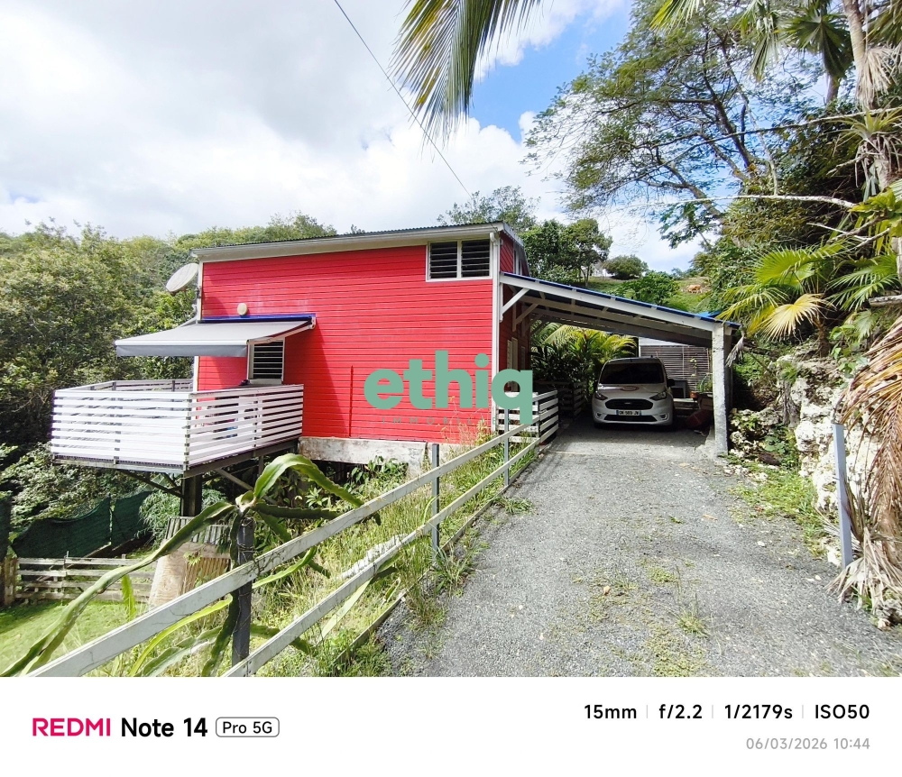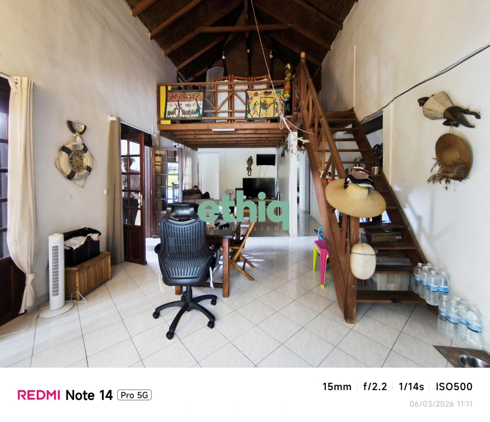 Située dans un environnement verdoyant à la limite entre Sainte-Anne et Le Moule, cette propriété de 1989 développe environ 206 m² habitables sur un terrain de 3 020 m² arboré. La surface au sol est de 337m² car il faut ajouter un atelier de 42 m² et quelques constructions en plus.