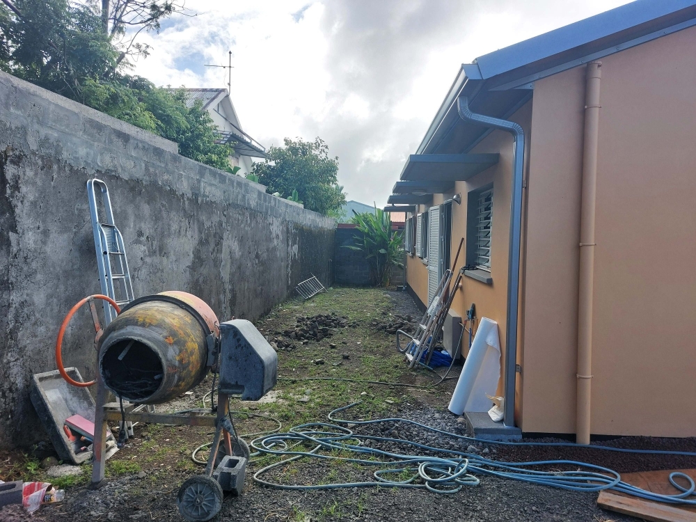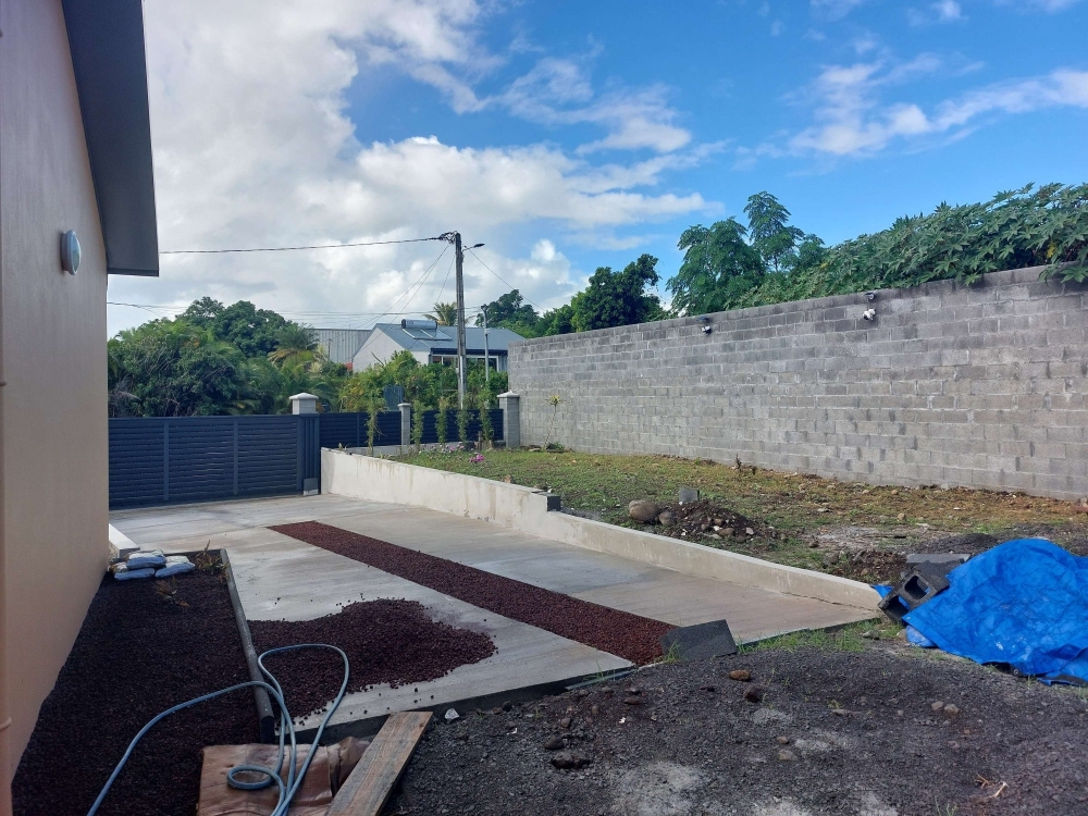 Une terrasse abritée d'une toile tendue est en train d'être faite à l'arrière et fera environ 18 m². Une allée bétonnée est prévue entre le portillon et la porte d'entrée.