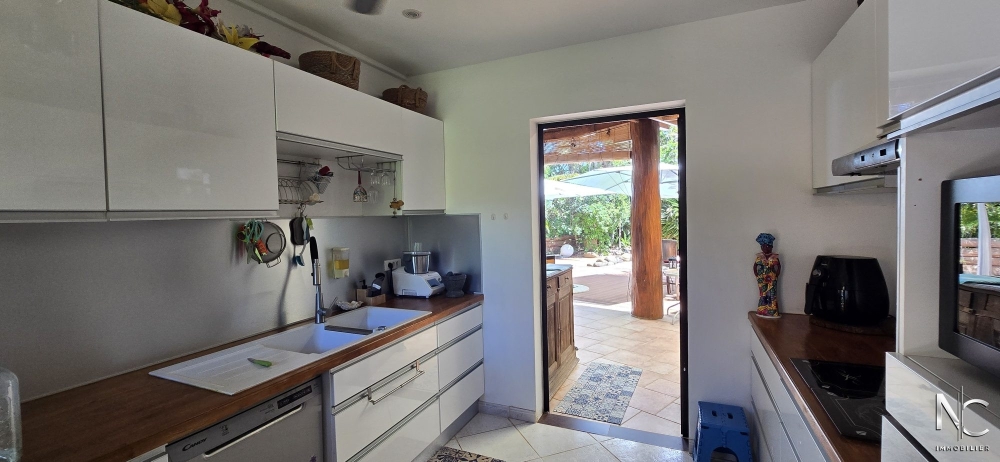 La villa principale séduit immédiatement par son architecture singulière et ses volumes généreux. Son vaste séjour octogonal d'environ 80 m², baigné de lumière, offre une vue panoramique exceptionnelle sur la mer et s'ouvre sur une superbe terrasse suspendue. La charpente apparente renforce le cachet et l'authenticité du lieu.