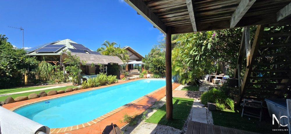 À l'arrière, à l'abri de tout regard, une grande terrasse conviviale accueille une piscine de 12 mètres et un faré, invitant à la détente dans un environnement préservé.