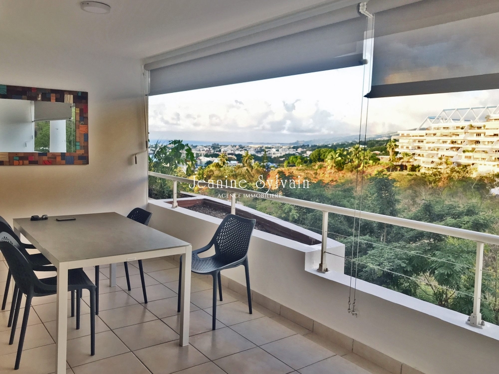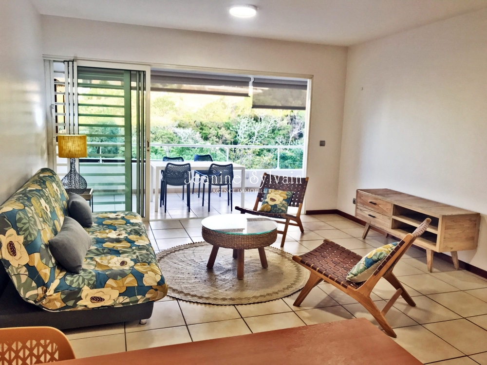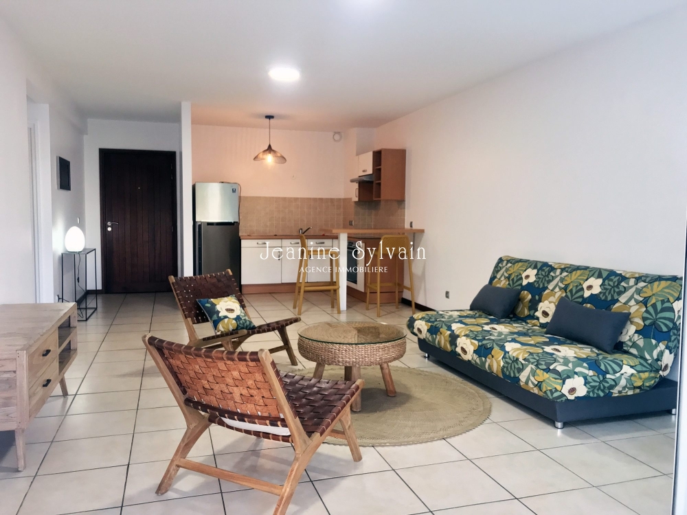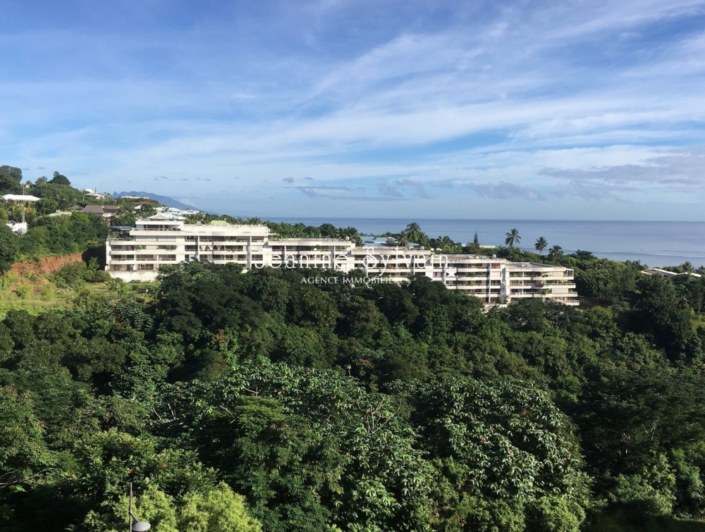 Dans résidence proche de Papeete, avec piscine et salle de sports, appartement avec vue mer comprenant 1 chambre climatisée, 1 salle d'eau avec WC séparé, buanderie, beau séjour-cuisine, grande terrasse couverte. Loué avec un parking couvert et un cellier.